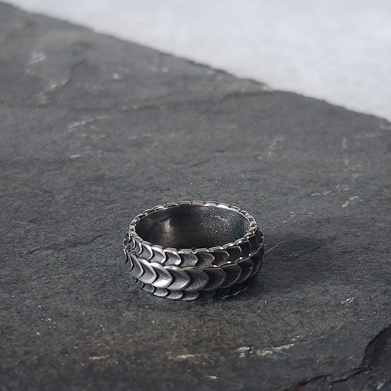 Feito em metal com acabamento prateado, o anel apresenta superfície com escamas em relevo que conferem um toque artesanal ao acessório. Largura média e interior liso para conforto prolongado. Ideal para quem busca uma peça com estilo único e robusto, sem perder a elegância.