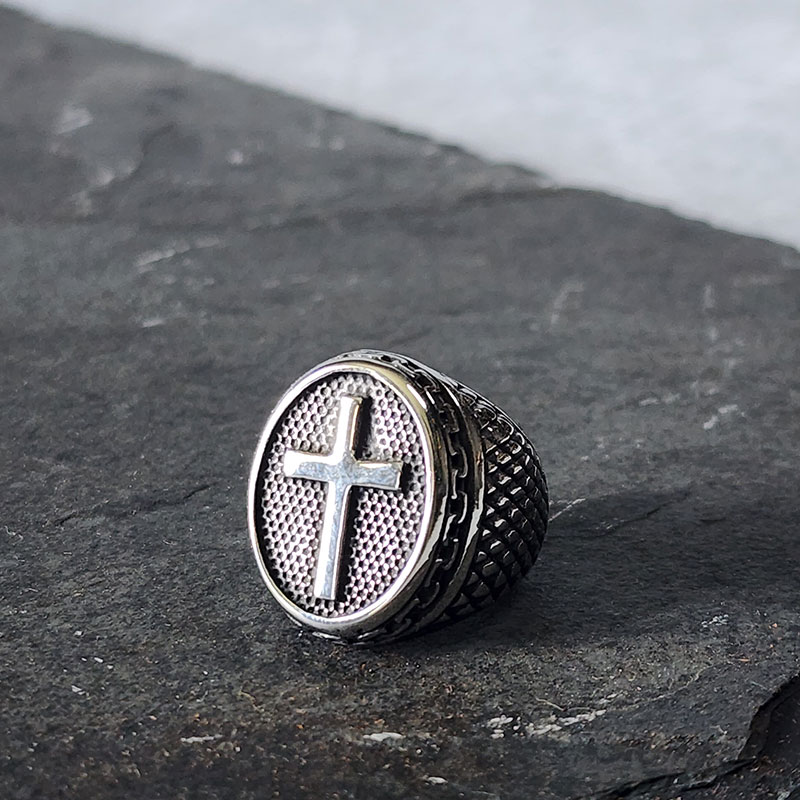 Anel masculino feito em aço com visual robusto e design que valoriza o estilo. Destaque para a cruz no topo e o acabamento texturizado que traz um toque moderno e único.