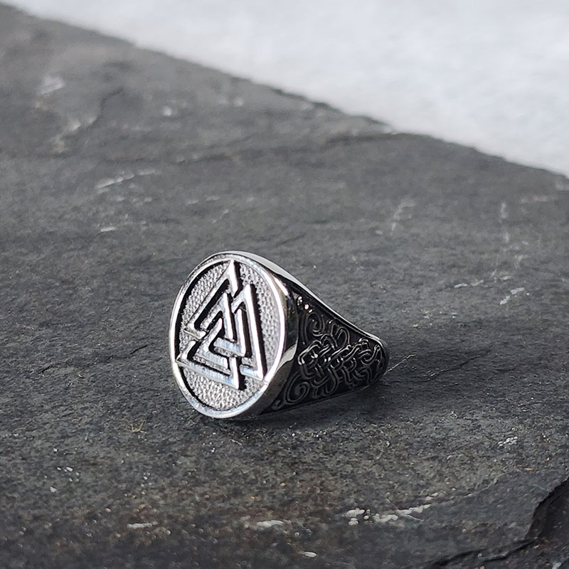 Fabricado em aço com textura polida, o anel apresenta um rosto oval com o símbolo Valknut em relevo. As laterais são adornadas com entalhes que reforçam a inspiração viking, conferindo personalidade e estilo marcante. O acabamento é suave, pensado para conforto no uso prolongado.