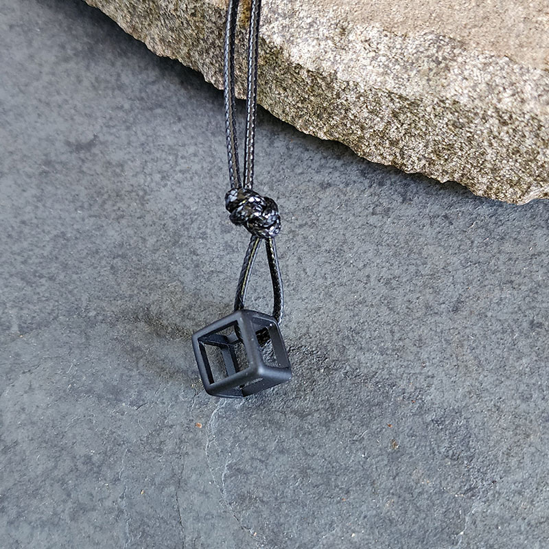 O colar possui um pingente pequeno em forma de cubo oco, tratado com acabamento fosco preto que evita reflexos, e é pendurado por uma corda resistente, com nó ajustável que permite adaptar o tamanho ao pescoço com facilidade. Esse design minimalista valoriza o look sem pesar.