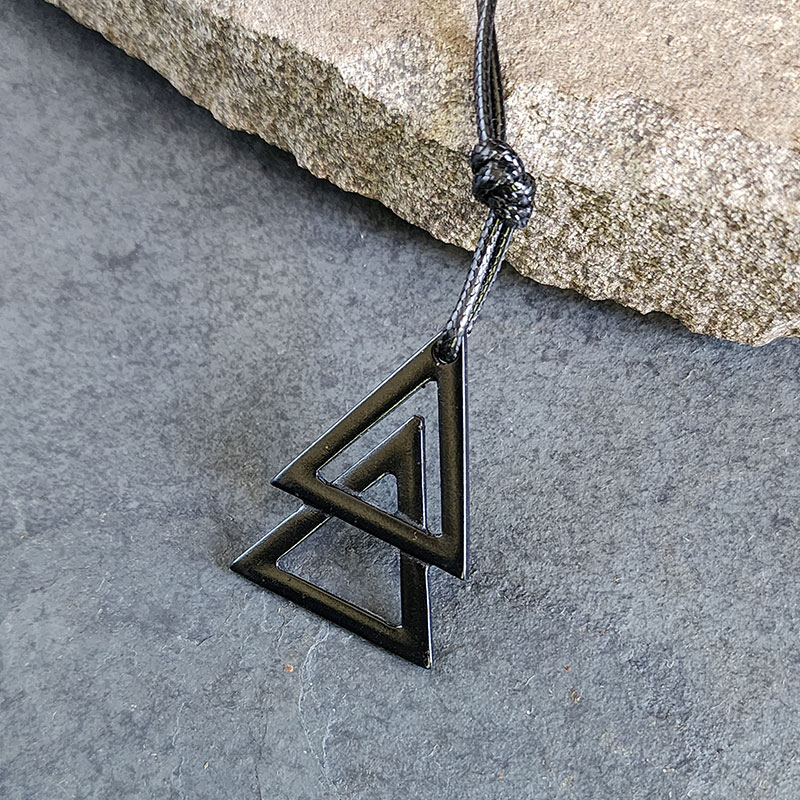 O pingente triangular é produzido em metal resistente com acabamento preto fosco. O cordão tem fecho ajustável em nó deslizante que facilita a regulagem do comprimento, oferecendo praticidade na hora de vestir.