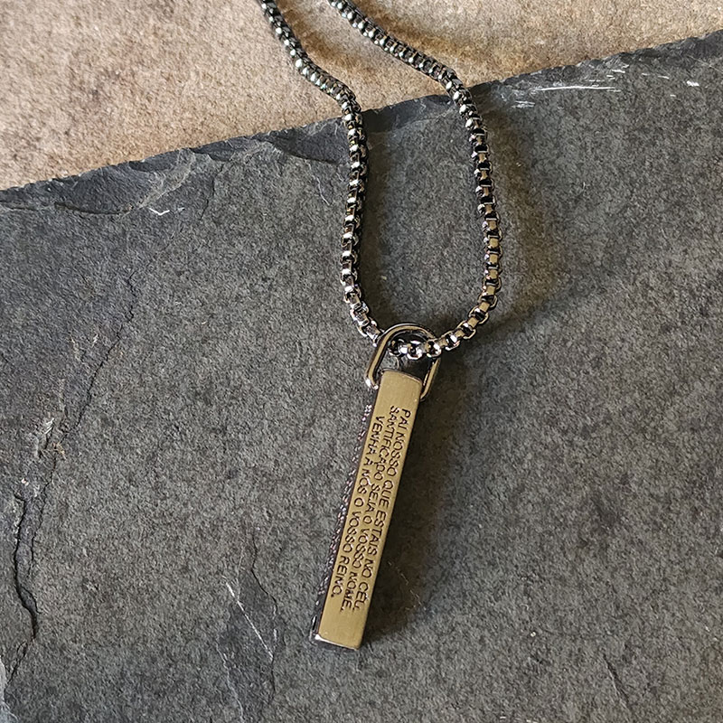 O pingente possui um design retilíneo e fino, com o texto gravado em todas as faces para melhor destaque. A corrente acompanha o pingente em um formato que facilita o uso, feita de material resistente e acabamento detalhado. É um símbolo de proteção e fé que você pode carregar sempre com você.