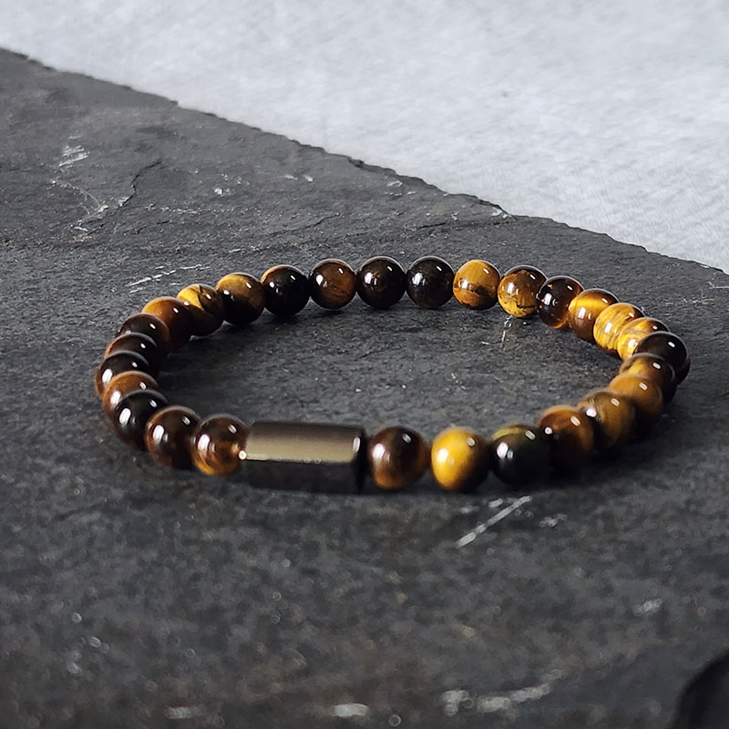 A pulseira é feita com pedras naturais de olho de tigre, conhecidas pela tonalidade marrom amarelada mesclada com áreas mais escuras. As pedras são polidas e alinhadas para criar um acessório harmônico.