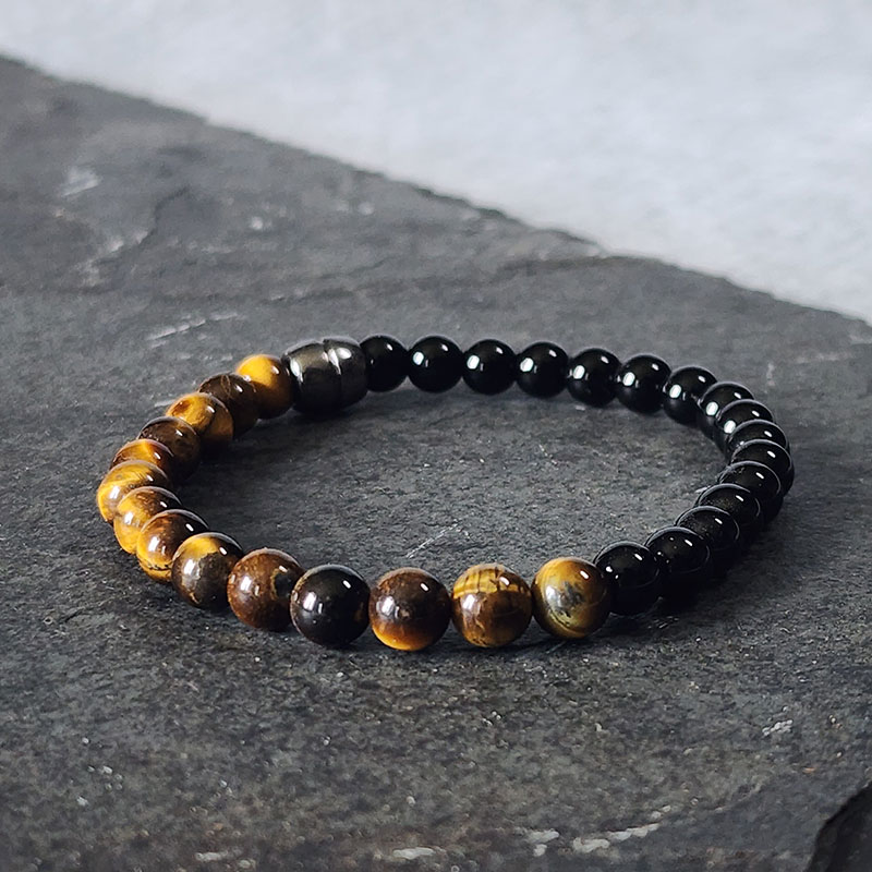 Pulseira composta por pedras naturais de ônix e olho de tigre, ideal para quem busca um acessório elegante e cheio de significado.